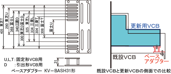 - 更新用VCBのメーカ、形名を限定すれば、電源負荷左右形用のKVアダプターを、電源負荷前後形や電源負荷上下形への適用が可能な場合もありますので、お問い合わせ下さい。但しパネル開口寸法等は適用するKVアダプターに応じて変更されます。