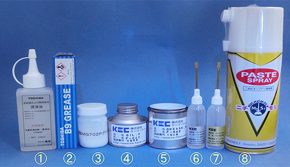 2)KV VCBメンテナンスキットに収納されるオイルは、各メーカ様とも下記現行品用として推奨されているものです。製造中止になっている旧型VCBへの適応可否につきましては、ご面倒ですが、各メーカー様にお問い合わせ下さい。